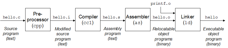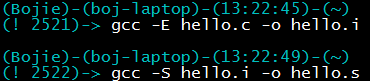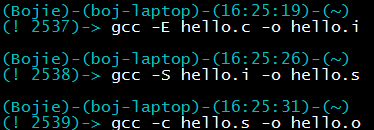 This process can be done with gcc -c hello.s -o hello.o, or you can directly call the assembler as: as hello.s -o hello.o. In fact, gcc is just a wrapper for cc1 (compiler), as (assembler), ld (linker), and the actual work is done by these tools. The following figure shows the three processes of hello.c preprocessing, compilation, and assembly.