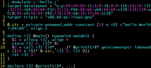 In contrast, clang’s intermediate representation is much more beautiful (at least from a human-readable perspective). clang -S -emit-llvm hello.c can generate LLVM (Low Level Virtual Machine) intermediate code hello.s (note this is not assembly code), clearly showing the definition of the main() function, the “Hello World\n” string (.str), the function call to printf and return 0.