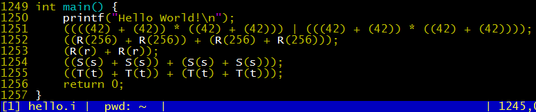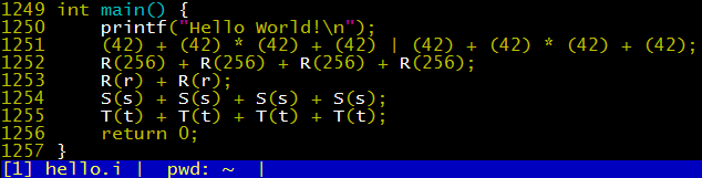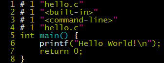 gcc -E hello.c -o hello.i can generate the preprocessed intermediate file hello.i. To show the process of macro expansion, we added some macro definitions in hello.c.