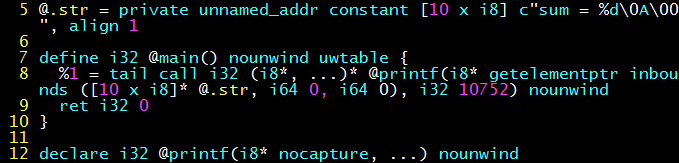 After enabling compilation optimization (clang -O1 -S -emit-llvm hello.c), you can see that the original lengthy intermediate code is left with a printf statement, its two parameters are the string “sum = %d\n” and the parameter 10752 (=42*256).