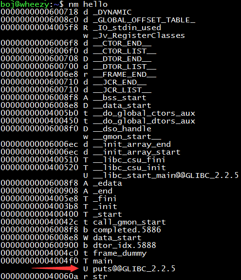 If you try nm hello this executable file, you will find that the puts function is still in an undefined state, only its name is suffixed, becoming puts@@GLIBC_2.2.5. This is because glibc is dynamically linked, that is, the code of the puts function is not put into the executable file, but is linked to the GLIBC_2.2.5 library in the file system when the hello program is running.