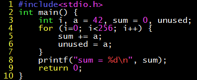 The intermediate language not only eliminates the combination explosion of “M programming languages, N architectures”, but also has important significance for compilation optimization. Many types of compilation optimizations are architecture-independent, such as constant propagation, dead code elimination. Look at the following C program, there is no input, the number of loop executions is also fixed, that is, the output sum can be pre-calculated; and unused is not output at all, that is, these assignment operations are meaningless.