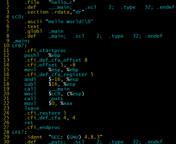 - Line 20 moves the pointer of the LC0 string “Hello World!\0” to the memory address pointed to by %esp as the first parameter of the printf function;