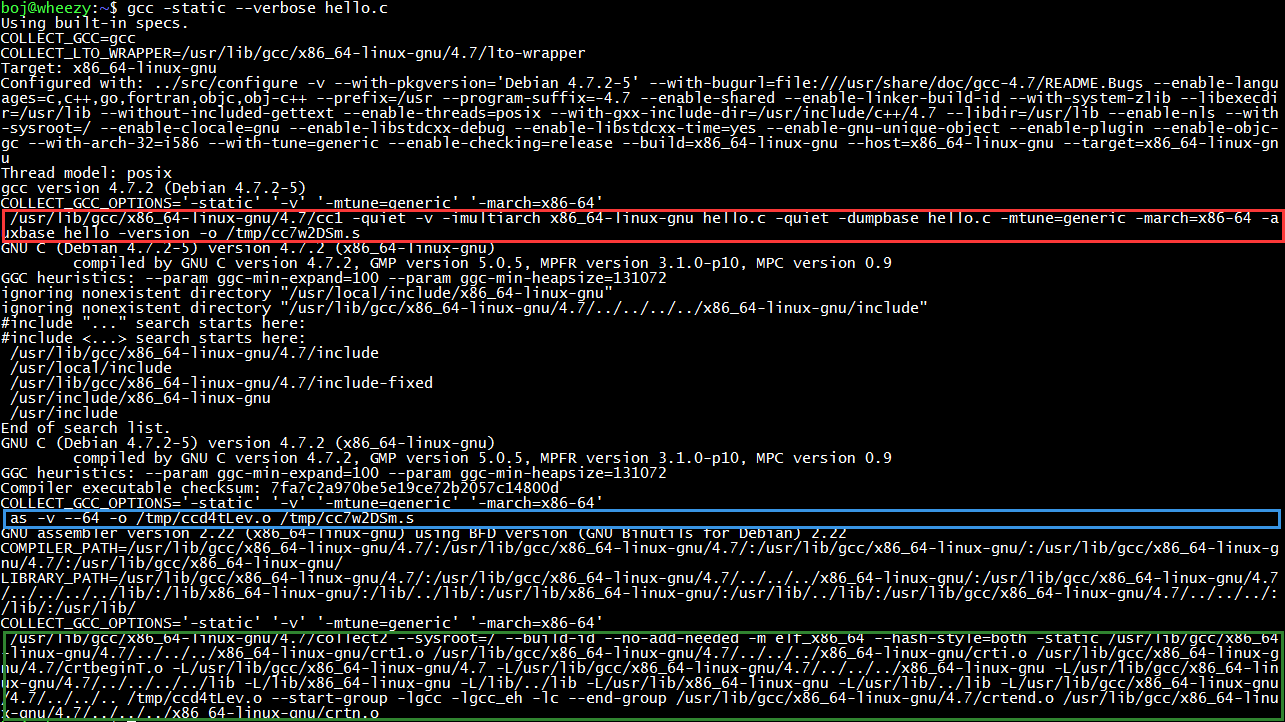 gcc can help us complete the process of finding libraries. gcc -static –verbose hello.c can output the detailed process of gcc compiling hello.c into an executable file, where the red box (cc1) is the preprocessing and compilation process, the blue box (as) is the assembly process, and the green box (collect2) is the linking process.