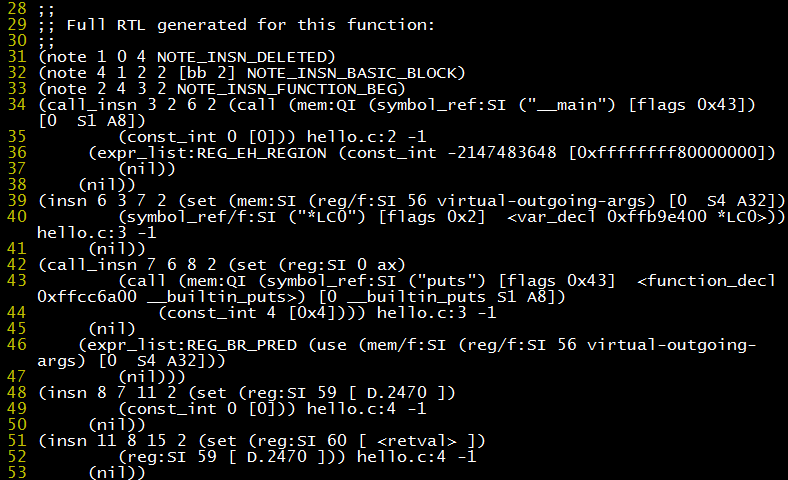 Obviously, such an intermediate language will not be simple. The intermediate language of gcc is called RTL, which looks obscure. Using gcc -S -fdump-rtl-expand hello.c can generate an intermediate language file hello.c.150r.expand (the number 150 may vary), the content is a tree structure represented in list form.