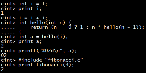 Since the statements in C language have no value, only expressions have value, and the interpreter only accepts statements as input, the print step in REPL is omitted, and there will only be output when the output statement is explicitly called. The only difference here from standard C language is that the statement does not need to be written in the main() function, but is executed line by line. In fact, the main() function in C language is a syntactic sugar, which means that all statements must be written in a function. In languages like Pascal, all statements not in any function are taken out and organized into a “main function”.