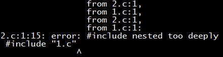 Of course, this does not mean that the preprocessing process will not fall into an infinite loop, because the expansion of #include is recursive. If we #include “2.c” in 1.c and #include “1.c” in 2.c, the preprocessing will output a long string of content and finally report an error: the recursion level is too deep! (Fortunately, gcc does not have a segmentation fault)