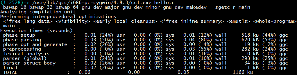 In fact, gcc -S calls the cc1 program for compilation. Directly calling the cc1 program, in addition to generating hello.s, will also print out the time consumed by cc1 compilation at each stage. We can see the preprocessing, lexical analysis, syntax analysis, assembly code generation and other stages.