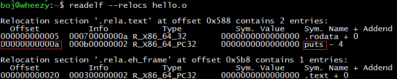 The 0xa to 0xd bytes of hello.o should store the address of the puts function, but there is no definition of the puts function in hello.c (this function is in the glibc library, which is part of the C standard library stdio, note that the implementation of the puts function is not in stdio.h, the header file only has the function declaration), so neither the compiler nor the assembler knows where it is, and can only fill in a 0 as a placeholder. This placeholder information is recorded in the relocation table, as shown in the red box below. What the linker does is to find the puts function in the glibc library, and then replace the 4 bytes at this placeholder with the real address of the puts function.