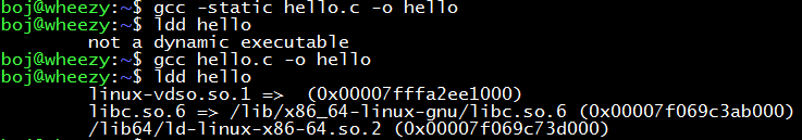 As you can see, to generate a statically linked (i.e., not dependent on any library) executable file, you still need to link many libraries. A small Hello World compiled executable file is 789 KB. If you do not use static linking, that is, use the default dynamic linking method, the generated executable file is only 6.7 KB.