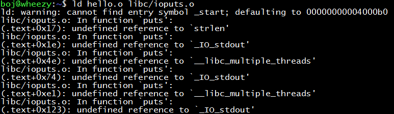 The reason here is that the ioputs.o in the libc library is not “self-sufficient”, but has many undefined symbols. One undefined symbol (puts) is eliminated, and thousands of undefined symbols emerge. Therefore, we have to go to find these undefined symbols, link the corresponding libraries, and recurse this process until all symbols are found.