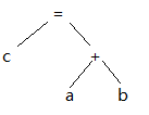 - Syntax analysis: Recognize that the four lexemes “c” “=” “a” “+” “b” form an assignment expression, and the right end of the assignment expression is an arithmetic expression, performing an addition operation. Form a syntax tree;