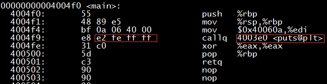 The assembly process has already produced machine code, so why do we still need linking? In fact, the unlinked target code (.o file) is not executable. If we disassemble the output of the previous assembly step (hello.o), we will be surprised to find that the place where the puts function was originally called, the jump target is actually the next instruction (as shown in the red box below)! What’s going on?