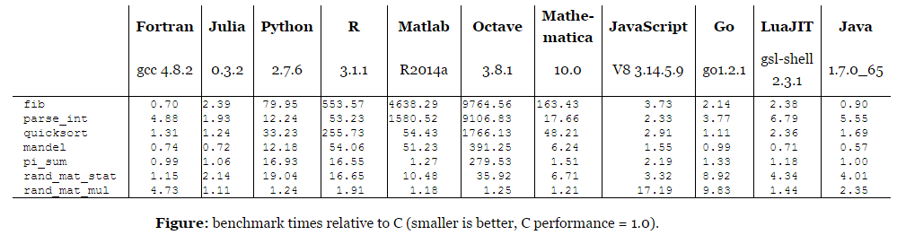 Comparison of various languages with C in terms of performance (Image source: http://julialang.org/)