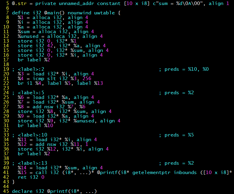 Without enabling compilation optimization, the generated LLVM intermediate code is as follows, you can see that the code faithfully performs loop, accumulation and assignment operations. (clang -O0 -S -emit-llvm hello.c)
